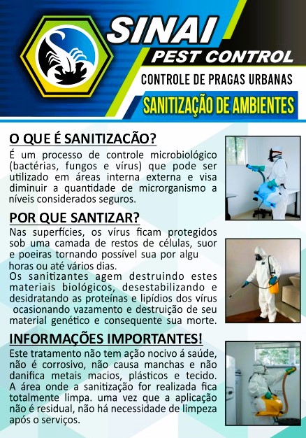 Na Sinai Controle de Pragas, somos especialistas no controle de pragas urbanas, oferecendo soluções seguras e eficientes para residências, comércios e indústrias, nosso compromisso é garantir ambientes mais limpos, seguros e livres de pragas, sempre com respeito ao meio ambiente e foco na satisfação dos nossos clientes